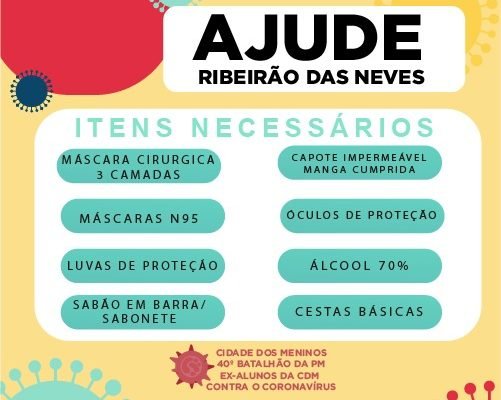 Campanha busca arrecadar ajuda para Ribeirão das Neves Redacao 30 de março de 2020 Notícias, Variedades Com o impacto da pandemia do novo Coronavírus, a população de Ribeirão das Neves vem sofrendo com a falta de itens básicos como sabão em barra, cesta básica, álcool 70%, entre outros. Diante da situação, a Cidade dos Meninos, a Polícia Militar de Ribeirão das Neves através do 40º Batalhão e o grupo Ex-alunos se juntaram para recolher itens necessários para a saúde da cidade. Os itens de doação são: – Máscara cirúrgica (3 camadas); – Máscaras nº 95 – Luvas de proteção; – Sabão em barra e sabonetes; – Capote impermeável manga cumprida; – Óculos de proteção; – Álcool 70%; – Cestas básicas. Como colaborar? Os itens podem ser doados nas bases comunitárias da Polícia Militar do Centro, bairro Jardim Colonial, Upa Justinópolis, Nova Pampulha, Maria Helena, Girassol, Veneza, Liberdade, Florença, San Genaro, entre 14h e 0h, e no 40º Batalhão de Ribeirão das Neves localizado na LMG 806, KM 07 – Bairro Fazenda das Lages. atualizado em 30/03/2020 - 17:26 comentários