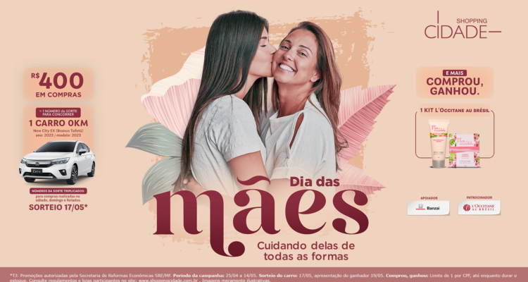 DIA DAS MÃES NO SHOPPING CIDADE: CUIDANDO DELAS DE TODAS AS FORMAS Redacao 27 de abril de 2023 Cultura, Notícias CAMPANHA RETRIBUI ZELO MATERNO COM MIMO L’OCCITANE E CHANCE DE UM CARRO ZERO KM COMO PRESENTE Comprando a partir de R$ 400, clientes levam pra casa kit de amenidades, além de um número da sorte para concorrer ao sorteio de um Honda New City sedan EX Não importa a idade dos filhos, para as mamães eles sempre vão precisar de uma dose extra de cuidado e proteção, afinal, quem nunca foi convencido a levar um casaco na mochila por conta de uma improvável queda da temperatura? Exemplos de entrega incondicional, um dia de celebração para elas parece pouco, e por conta de um consenso de que todos os dias são delas, o segundo domingo de maio se tornou uma das mais justas homenagens do calendário. Valorizando todo esse cuidado, marca permanente na relação das mães com seus filhos, o Shopping Cidade lança sua campanha “Dia das Mães: Cuidando Delas De Todas As Formas”, uma maneira de parabenizá-las e também viabilizar aos filhos uma retribuição de amor e carinho. Até o dia 14 de maio, os clientes que acumularem R$ 400 em compras no empreendimento – válido para as lojas aderentes, incluindo gastos com alimentação – vão receber dois presentes na hora, sendo um kit de amenidades para complementar o presente da mamãe, e um número da sorte para concorrer ao sorteio de um carro zero km. “Em parceria com a L’occitane, nossa patrocinadora, iremos presentear os clientes que alcançarem o valor estipulado durante os dias da campanha com um kit Au Brésil contendo um desodorante corporal com textura de leite e um sabonete base vegetal com fragrância floral, ambos os produtos inspirados na essência delicada da Flor de Carambola, linha conhecida da marca francesa de cosméticos. Além disso, o valor em compras citado também dará direito a um número da sorte que vai concorrer ao sorteio de um New City Sedan EX zerinho, uma ação com o apoio da Honda Bansai”, destaca o gerente de marketing do Shopping Cidade, André Santi. Com uma ilha instalada no piso Tupis e outra no piso Goitacazes, os clientes poderão cadastrar os cupons fiscais em totens eletrônicos, com suporte dos promotores da campanha, tanto para garantir o brinde quanto para retirar o número da sorte. “A campanha de Dia das Mães marca ainda nossa primeira ação de compre e ganhe e compre e concorra com cadastro disponível pelo app do mall, lançado no fim do último mês. Através dele, os clientes poderão completar as fases do processo sem filas, exceto para a retirada do kit, que será entregue no piso Tupis, em frente à loja Valisere”, explica André. Uma grande novidade para a campanha deste ano será a chance triplicada de levar o carro zero km para casa. Nas compras realizadas no sábado, domingo e feriados, o número da sorte será turbinado, rendendo até três vezes mais que em compras realizadas nos demais dias. “Quando o cliente cadastrar as notas fiscais das compras realizadas no shopping, o sistema automaticamente irá captar o dia da compra. Se todo o valor da campanha tiver sido gasto nos dias da ação turbinada, ao invés de levar um único número da sorte para concorrer ao carro, ele levará três”, revela o gestor. De acordo com André Santi, o período de Dia das Mães para o varejo é, tradicionalmente, uma data de aquecimento nas vendas e, portanto, de grande expectativa para os lojistas. “Sempre trabalhamos com a expectativa de superar os números do ano anterior e agora não será diferente. Normalmente o Dia das Mães só fica atrás do Natal, e por isso planejamos uma ação do tamanho da data, contemplando nossos clientes com o compre e ganhe, garantindo um brinde superespecial da nossa patrocinadora, e quem sabe a chance de levar um carro com valor de mercado acima de R$ 119 mil”, encerra. SERVIÇO Dia das Mães no Shopping Cidade: Cuidando Delas De Todas As Formas Período da campanha: 25/4 a 14/5 Condições: válido para compras acima de R$ 400 Prêmio: kit L’occitane Au Brésil (um desodorante corporal e um sabonete) + 1 número da sorte para concorrer a um New City Sedan EX 0 km Local de cadastro dos cupons fiscais: através do app do Shopping Cidade ou nas ilhas da campanha, instaladas nos pisos Tupis (em frente à Valisere) e Goitacazes (em frente à Renner) Local para a retirada do brinde: piso Tupis, em frente à Valisere Data do sorteio: 17/05 atualizado em 27/04/2023 - 15:58 comentários