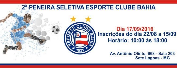 Esporte Clube Bahia busca talentos do futebol em Sete Lagoas Redacao 8 de setembro de 2016 Cultura, Notícias Seletiva será realizada no dia 17 de setembro no Campo do Bela Vista Com objetivo de revelar novos talentos do futebol, o Esporte Clube Bahia marcou a data para a seletiva de atletas em Sete Lagoas. No dia 17 de setembro, sábado, das 8h às 17h, o Campo do Bela Vista (Rua Tupiniquins, Bairro Santa Luzia, Sete Lagoas, MG) receberá atletas de toda a região que serão avaliados pela equipe técnica do clube. Para participar é necessário realizar a inscrição previamente, até o dia 15 de setembro, no escritório do 7 Fest (Av. Antônio Olinto, 968, sala 203, Centro, Sete Lagoas).Os candidatos deverão apresentar, até o dia da seletiva, os exames de eletrocardiograma e de aptidão física, com no máximo 3 meses da data de realização, e também a autorização dos pais ou responsáveis, além do pagamento da taxa de R$ 30,00. Poderão se inscrever atletas nascidos nos anos de 1998/1999, 2000/2001, 2002/2003.Os inscritos passarão por uma pré-seleção e serão escolhidos os atletas de melhor performance. Os jogadores selecionados serão levados para treinar no Centro de Treinamento da categoria de base do Esporte Clube Bahia. Esta é a segunda vez que o Esporte Clube Bahia realizada uma peneira na cidade de Sete Lagoas. Cinco atletas foram selecionadas na primeira edição e foram enviados para a categoria de base do time. Serviço: Seletiva do Esporte Clube Bahia em Sete Lagoas Data: 17 de setembro, sábado Horário: 8h às 17h Local: Campo do Bela Vista – Rua Tupiniquins, Bairro Santa Luzia, Sete Lagoas, MG Inscrições: até o dia 15 de setembro no escritório do 7 Fest – Av. Antônio Olinto, 968, sala 203, Centro, Sete Lagoas, MG) Taxa: R$ 30,00 Mais informações: (31) 3697-3002 comentários
